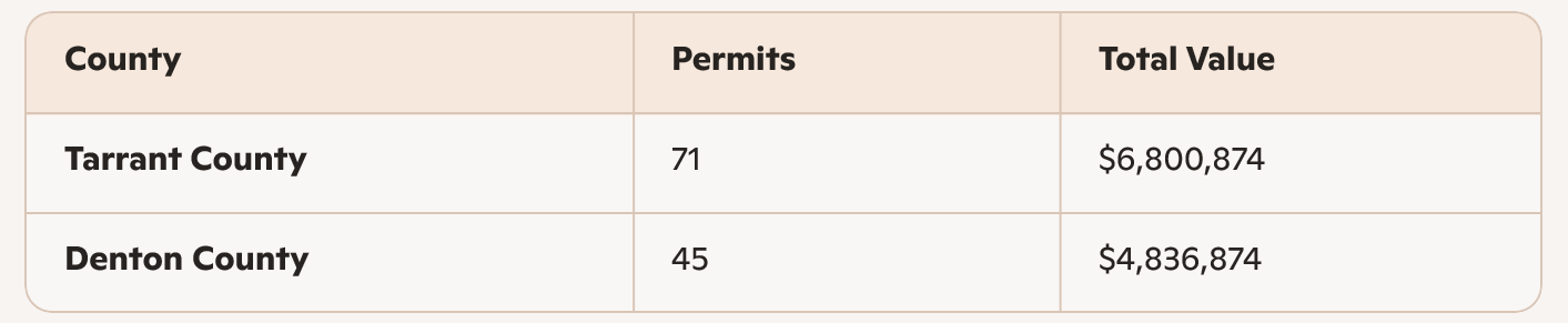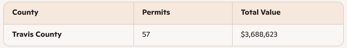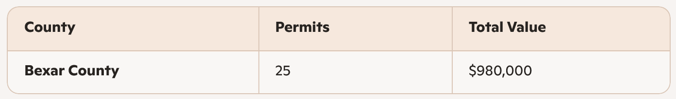 San Antonio posted the lowest total volume and lowest average project valuation among the four metros analyzed. With 33 of 42 permits concentrated in Bexar County, the market exhibits moderate centralization similar to Austin, though at a smaller scale. The comparatively lower valuation may reflect more standardized installations, entry-level builds, or smaller residential lot configurations.