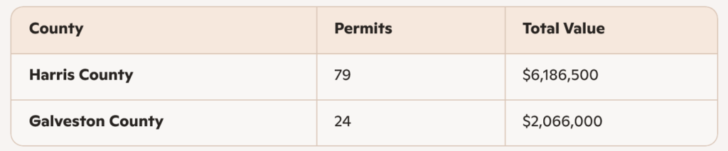 Houston’s average value remained solidly above $80K, reflecting consistent investment levels in established suburban communities. Harris County accounted for the majority of activity, while Galveston’s coastal markets contributed meaningfully to overall valuation.