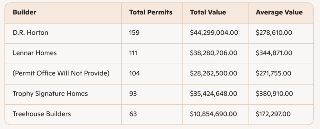 Out of the top five, Chesmar Homes distinguished itself with the highest average value ($431,507), reflecting a focus on larger or more upscale projects. By contrast, KB Homes and Lennar Homes maintained high permit volumes but at lower average values, suggesting a strategy centered on affordability and entry-level housing.