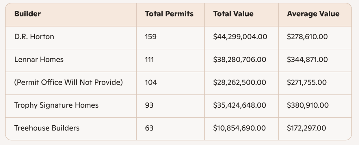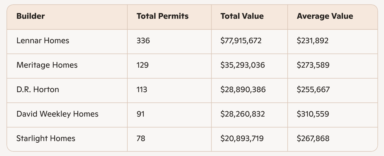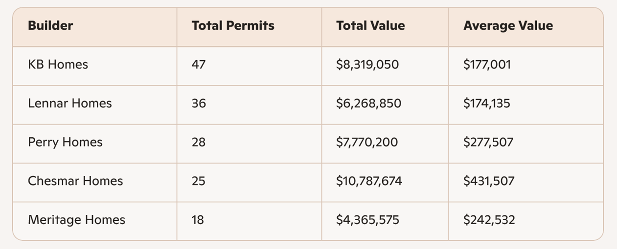 Out of the top five, Chesmar Homes distinguished itself with the highest average value ($431,507), reflecting a focus on larger or more upscale projects. By contrast, KB Homes and Lennar Homes maintained high permit volumes but at lower average values, suggesting a strategy centered on affordability and entry-level housing.
