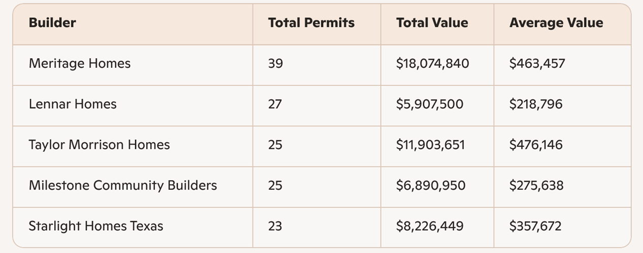 Dallas recorded 1,517 new residential permits in October, spread across 165 builders. The top five builders by permit volume were:
