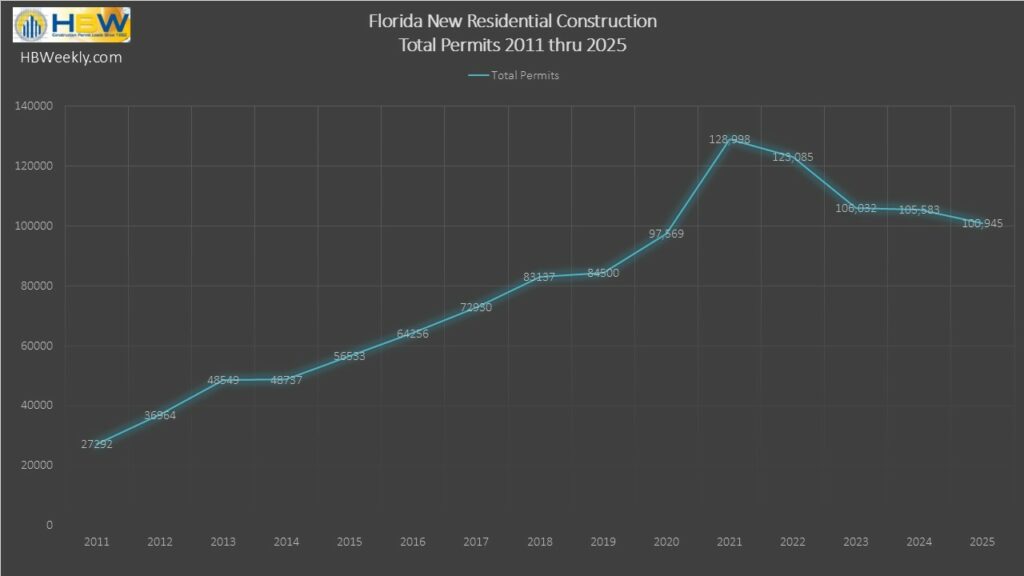 Florida’s residential construction market ended 2025 on a quieter note. According to HBW’s Building Activity Trend Report, new residential permitting across the state declined approximately 4% year over year, totaling 100,945 new permits for the year, compared to 105,583 in 2024.