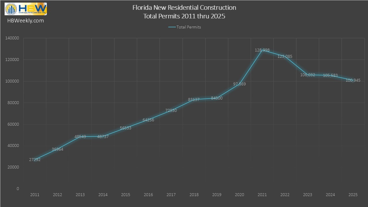 Florida’s residential construction market ended 2025 on a quieter note. According to HBW’s Building Activity Trend Report, new residential permitting across the state declined approximately 4% year over year, totaling 100,945 new permits for the year, compared to 105,583 in 2024.