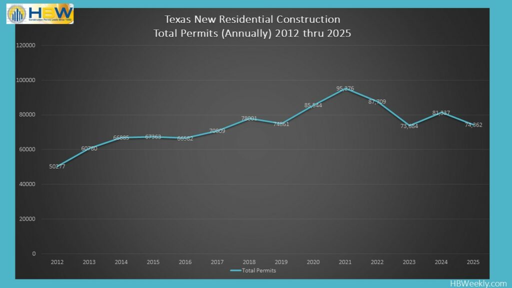 Texas wrapped up 2025 with just over 74,350 new residential construction permits on record, according to the latest HBW Building Activity Trend Report. For a state that leads the nation in homebuilding, last year’s 9% dip in permit volume feels less like a red flag and more like a market taking a breather. What makes 2025 particularly interesting is how it contrasts with the year before. In 2024, Texas actually had a 10% increase in new permits — a rebound after two years of contraction, including an 8% decline in 2022 and a much steeper 16% drop in 2023. So, the pullback in 2025 doesn’t necessarily signal issues. Instead, it fits into the broader ebb and flow that naturally occurs in a high‑growth, high‑demand market like Texas. When a state builds as aggressively as Texas does, occasional recalibration is expected.