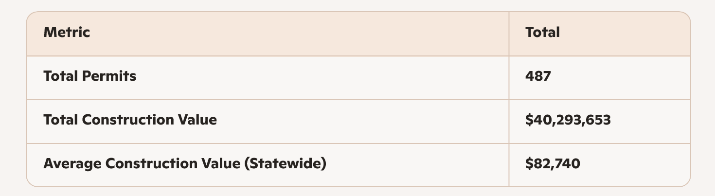 Below is a detailed breakdown of activity by region, including permit volume, construction value, average value, and leading counties.