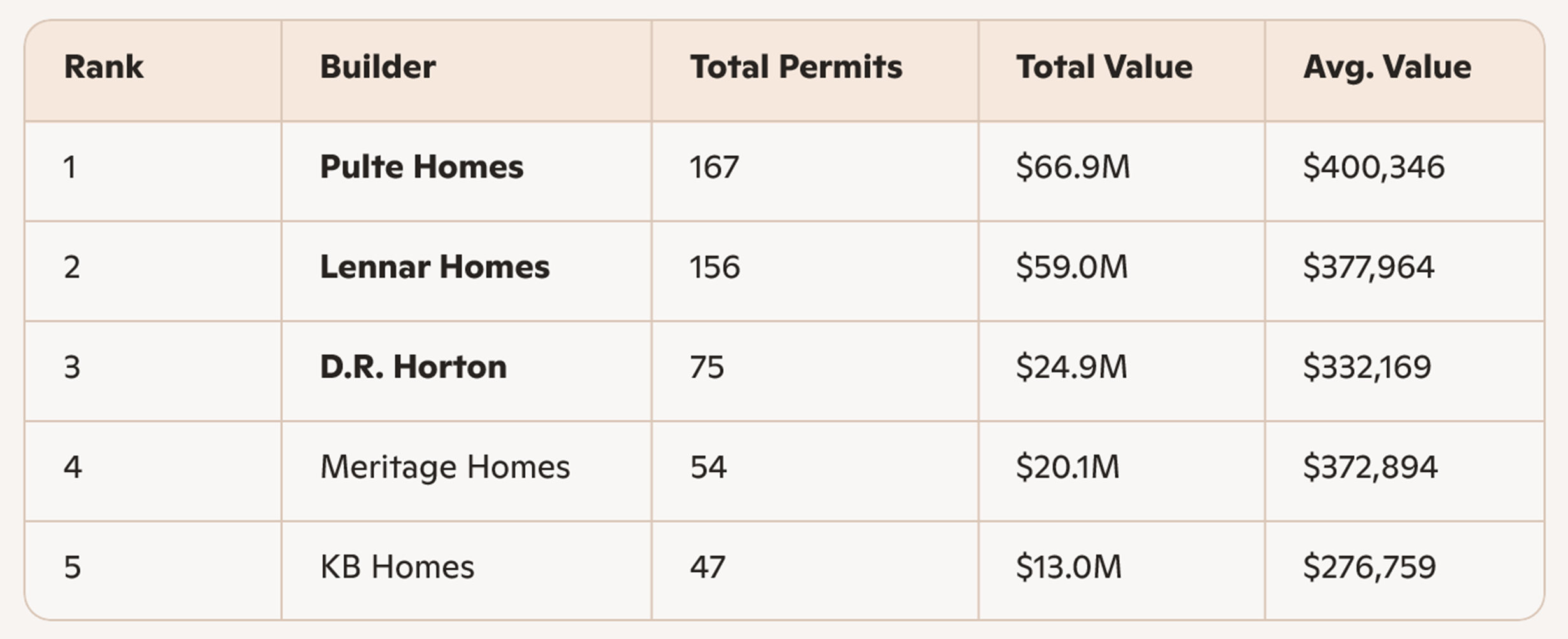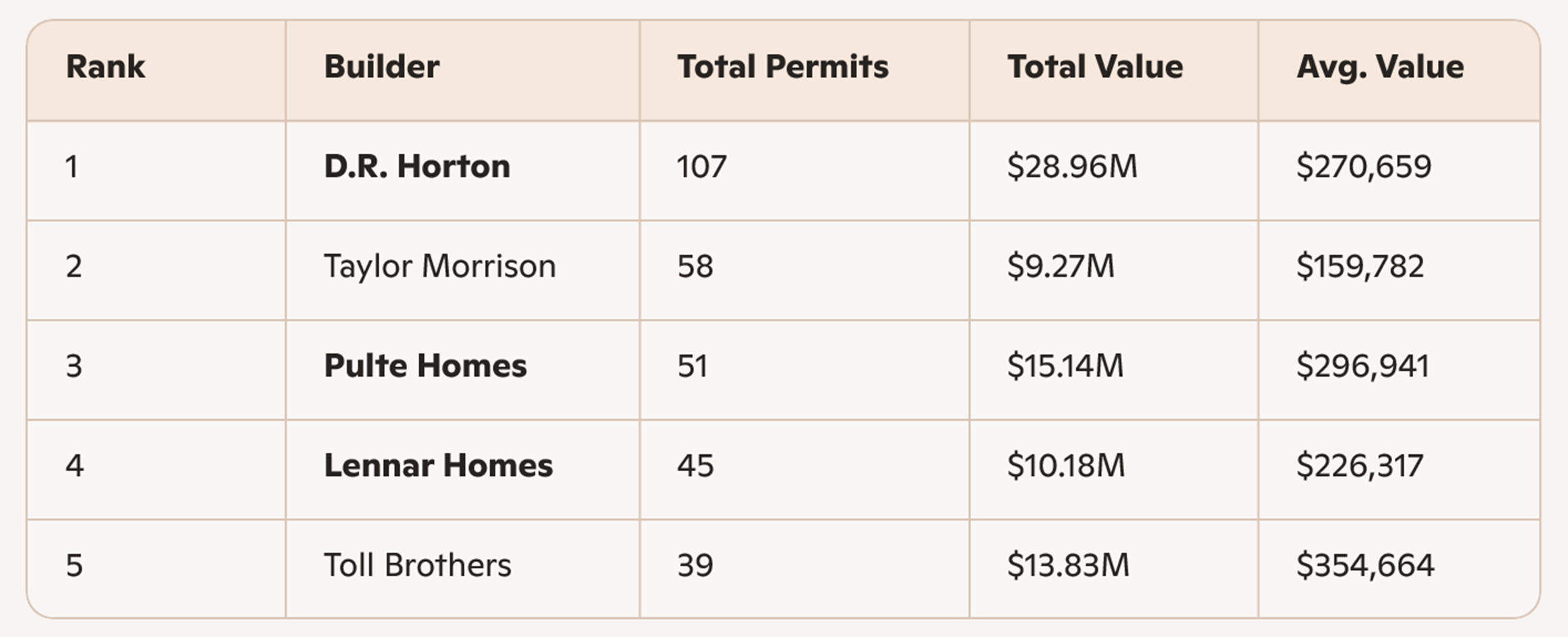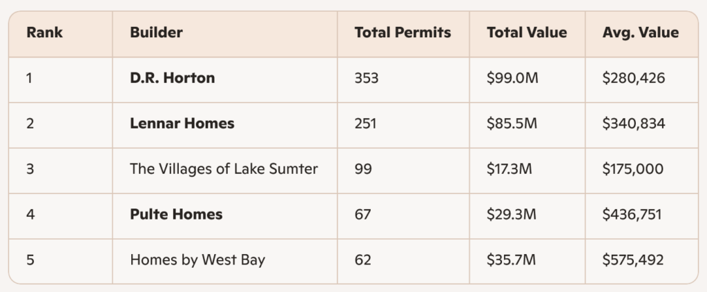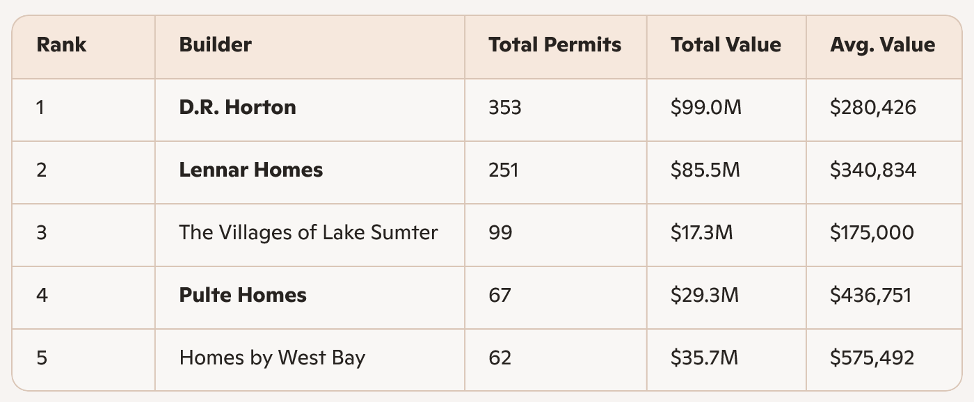 Tampa and Southeast Florida show the highest average construction values among top builders, reflecting strong demand for higher‑end residential products. Jacksonville and Southwest Florida continue to offer more moderate price points while maintaining high permit volume.