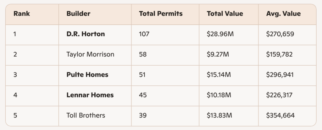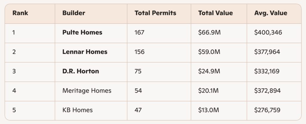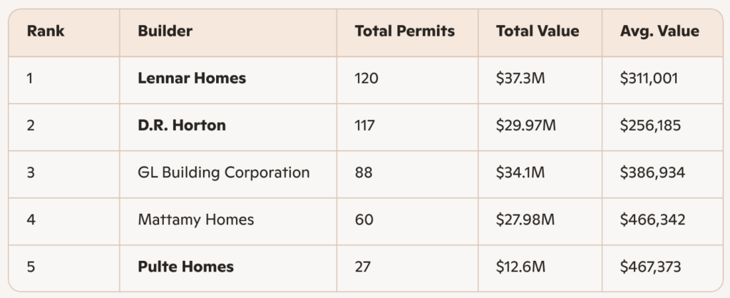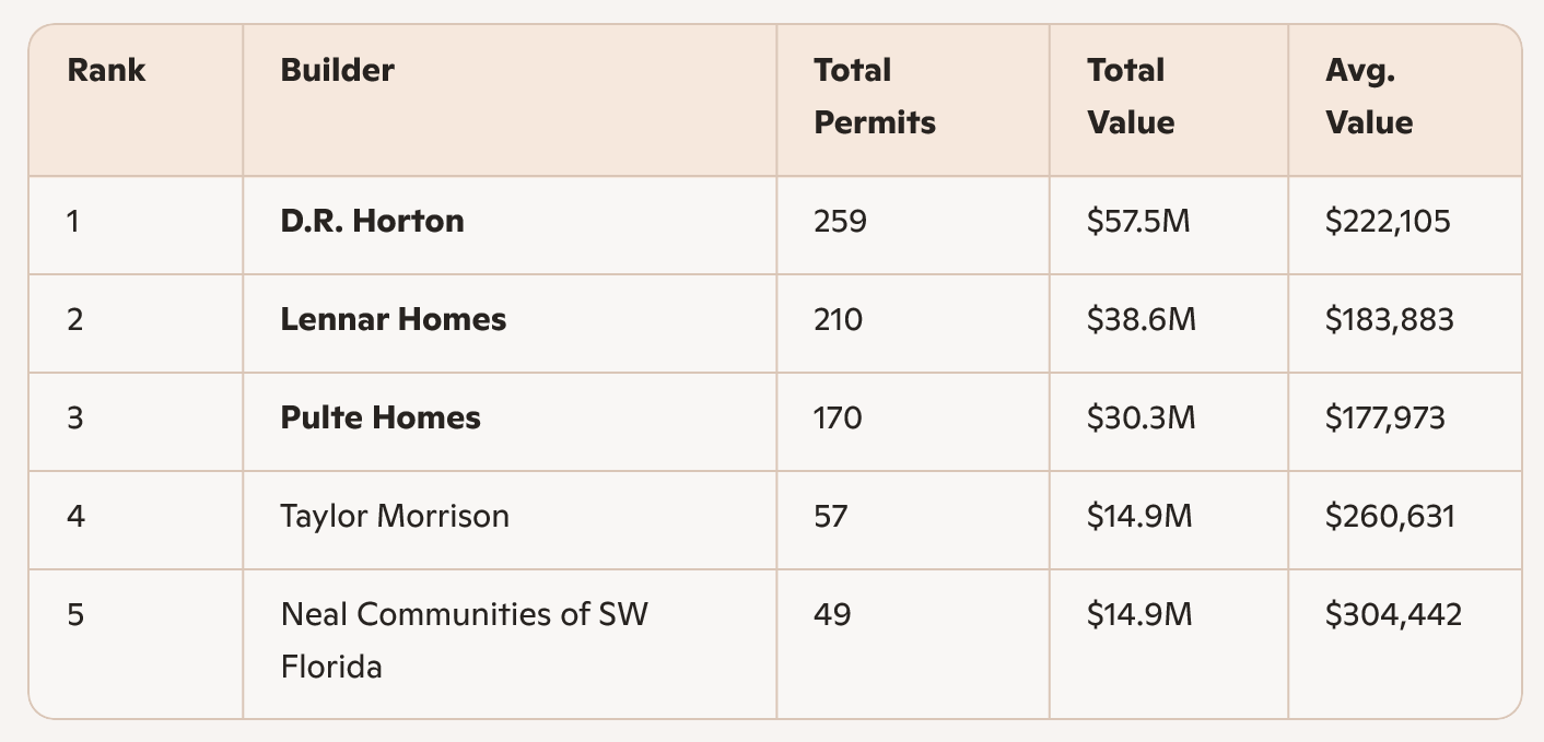 Southwest Florida continues to be a stronghold for the “big three”—D.R. Horton, Lennar, and Pulte—each securing triple‑digit permit volumes. Neal Communities remains a notable regional competitor with one of the highest average values among the top five.