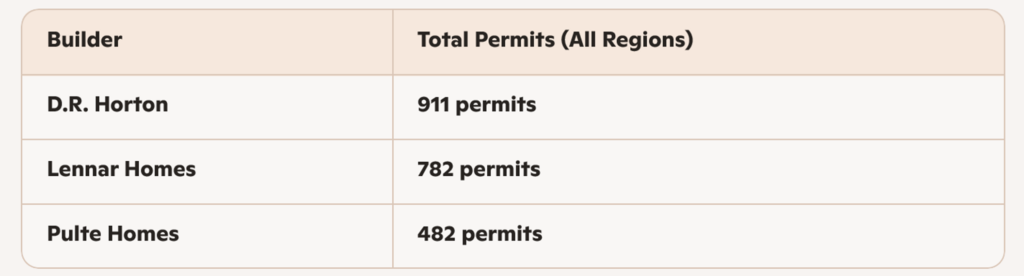 The latest data clearly demonstrates that while regional builders continue to play important roles in their respective markets, the statewide landscape is dominated by three major players: D.R. Horton, Lennar Homes, and Pulte Homes. The mega-builders’ consistent presence across all five major regions—and their combined permit volume exceeding 2,100—highlights their continued influence on Florida’s housing market and their ability to adapt to shifting regional dynamics.