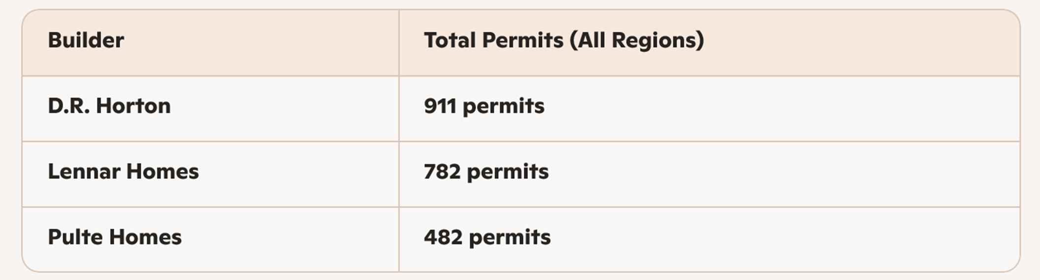 The three leading builders listed above—D.R. Horton, Lennar, and Pulte—appear in the top five of every region, underscoring their extensive geographic reach and operational scale. Their combined total of 2,175 permits accounts for more than one‑third of all new residential construction activity statewide during February.